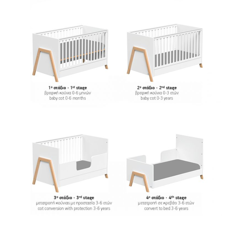 - Η διάσταση της κούνιας είναι 156 x 78 x 93 cm, ενώ μετά τη μετατροπή της σε κρεβατάκι, οι διαστάσεις παραμένουν ίδιες