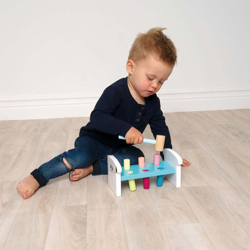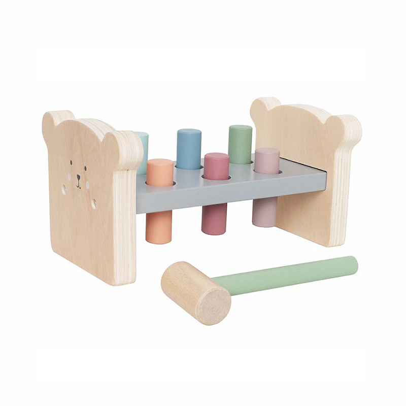 Ξύλινος πάγκος με κυλίνδρους και σφυρί, από την Jabadabado.Ένα διασκεδαστικό παιχνίδι και παράλληλα εκπαιδευτικό που βοηθάει στην εξάσκηση της λεπτής κινητικότητας και στο συντονισμό των χεριών και των ματιών.
