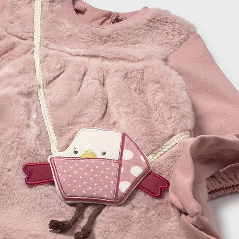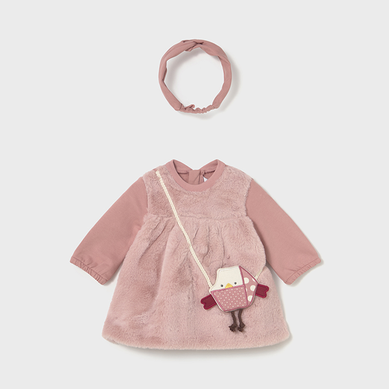 Σετ φορεματάκι με κορδέλα για τα μαλλιά, για νεογέννητο κορίτσι εως 18 μηνών από την Mayoral. Ένα τέλειο φορεματάκι, για να κάνετε εντύπωση σε κάθε σας έξοδο. Ανοίγει με φερμουάρ στο πίσω μέρος για να είναι ευκολοφόρετο, ενώ η γούνα στο μπροστινό και το ραμμένο τσαντάκι του δίνει στυλ και το κάνει μοναδικό. Το σετ ολοκληρώνεται με μια κορδέλα για τα μαλλιά στο ίδιο ύφος. Μπορείτε να τα συνδυάσετε με τα παπουτσάκια αγκαλιάς και τα υπόλοιπα αξεσουάρ της συλλογής New Born της Mayoral και να δημιουργήσετε ένα τέλειο σύνολο.