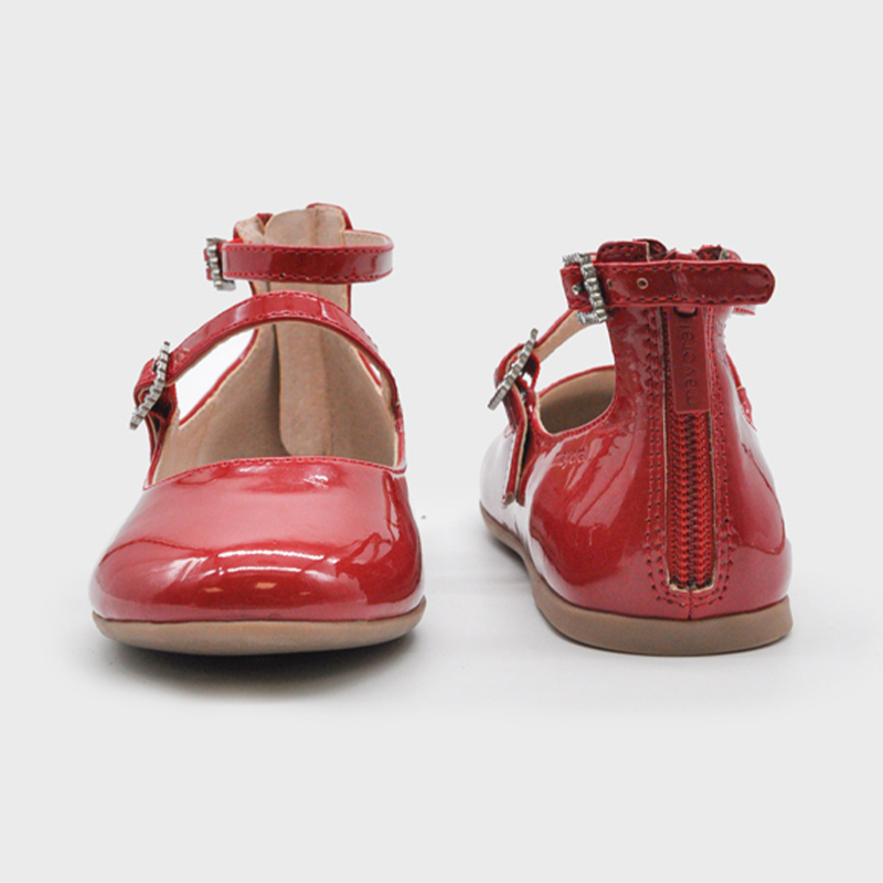 Παιδικές Μπαλαρίνες από την Mayoral. Δένει με ρυθμιζόμενο λουράκι με αγκράφα στον αστράγαλο, ενώ ρυθμίζεται και η μπαρέτα για τέλεια εφαρμογή. Στο πίσω μέρος διαθέτουν φερμουάρ, για να μπορούν τα παιδιά να τις φοράνε μόνα τους. Η ιδανική επιλογή για τα αμπιγιέ ντυσίματα ενός κοριτσιού. Το λουστρίνι και τα στρασάκια στις αγκράφες τις κάνουν άκρως εντυπωσιακές και τις εμφανίσεις του κοριτσιού σας μοναδικές. Διαθέτουν δερμάτινο πάτο και αντιολισθητική σόλα για μέγιστη άνεση και ασφάλεια.