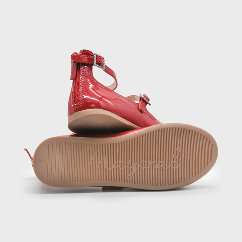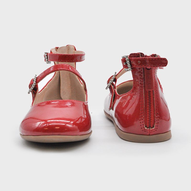 Παιδικές Μπαλαρίνες από την Mayoral. Δένει με ρυθμιζόμενο λουράκι με αγκράφα στον αστράγαλο, ενώ ρυθμίζεται και η μπαρέτα για τέλεια εφαρμογή. Στο πίσω μέρος διαθέτουν φερμουάρ, για να μπορούν τα παιδιά να τις φοράνε μόνα τους. Η ιδανική επιλογή για τα αμπιγιέ ντυσίματα ενός κοριτσιού. Το λουστρίνι και τα στρασάκια στις αγκράφες τις κάνουν άκρως εντυπωσιακές και τις εμφανίσεις του κοριτσιού σας μοναδικές. Διαθέτουν δερμάτινο πάτο και αντιολισθητική σόλα για μέγιστη άνεση και ασφάλεια.