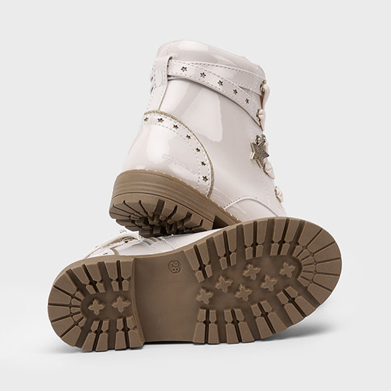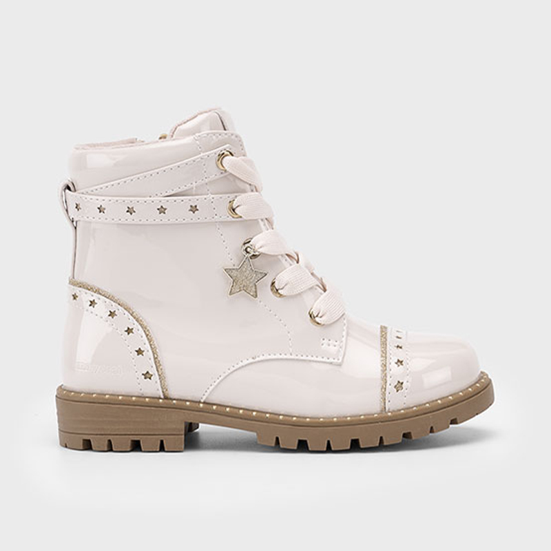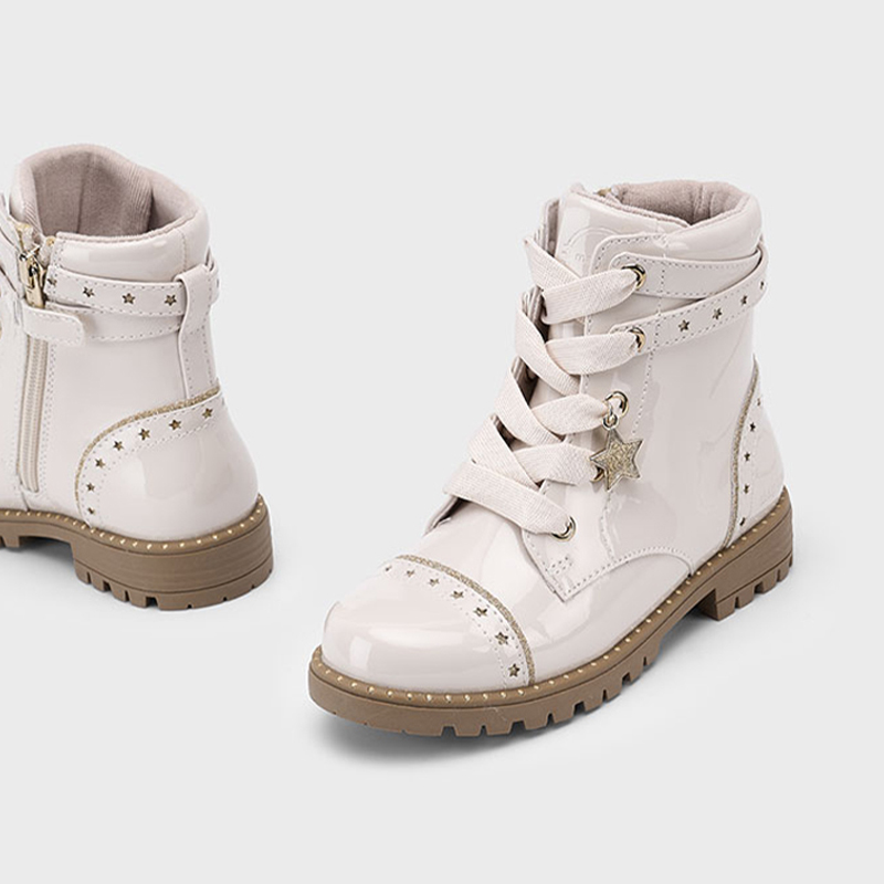 Παιδικά μποτάκια από την Mayoral. Με κορδόνια και φερμουάρ στο πλάι για τέλεια εφαρμογή. Εξωτερικά είναι κατασκευασμένα από συνθετικό υλικό, ενώ εσωτερικά διαθέτουν υφασμάτινη επένδυση για το κρύο. Με εύκαμπτη τρακτερωτή σόλα που προσφέρει μέγιστη άνεση και σταθερότητα. Το λουστρίνι καθώς και τα μεταλλικά στοιχεία δίνουν έξτρα λάμψη και κάνει τις εμφανίσεις του κοριτσιού σας μοναδικές.