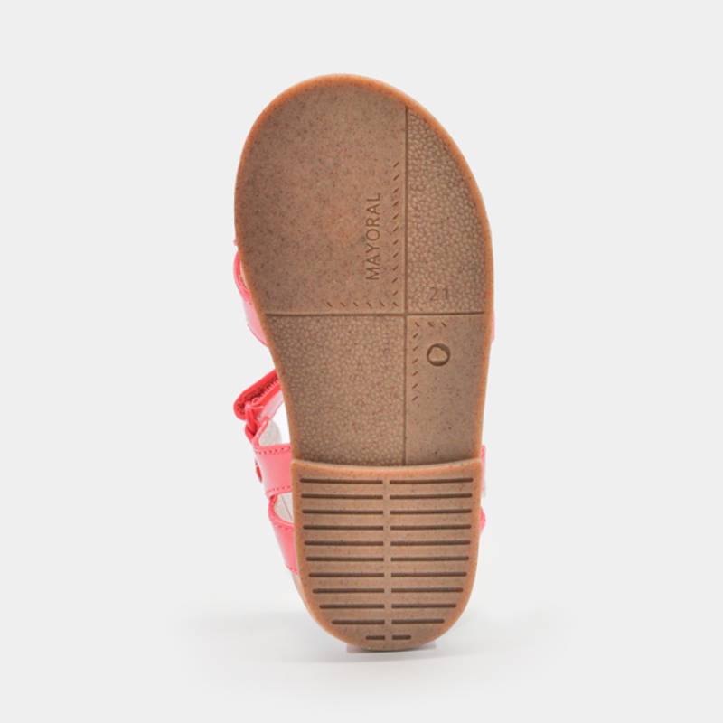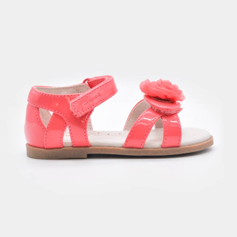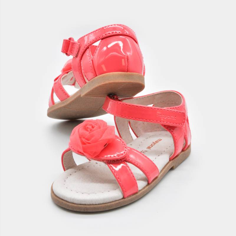 Παιδικά σανδάλια από την Mayoral. Με ρυθμιζόμενο βέλκρο, που αγκαλιάζει τέλεια τον αστράγαλο για μέγιστη άνεση και σταθερότητα. Επίσης ρυθμίζονται και στο μπροστινό μέρος ανάλογα με το φάρδος του ποδιού. Η ιδανική επιλογή για τα αμπιγιέ ντυσίματα ενός κοριτσιού. Το λουστρίνι και το λουλουδάκι που κοσμεί το μπροστινό μέρος, τα κάνουν άκρως εντυπωσιακά. Διαθέτουν μαλακό, δερμάτινο πάτο καθώς και αντιολισθητική σόλα.