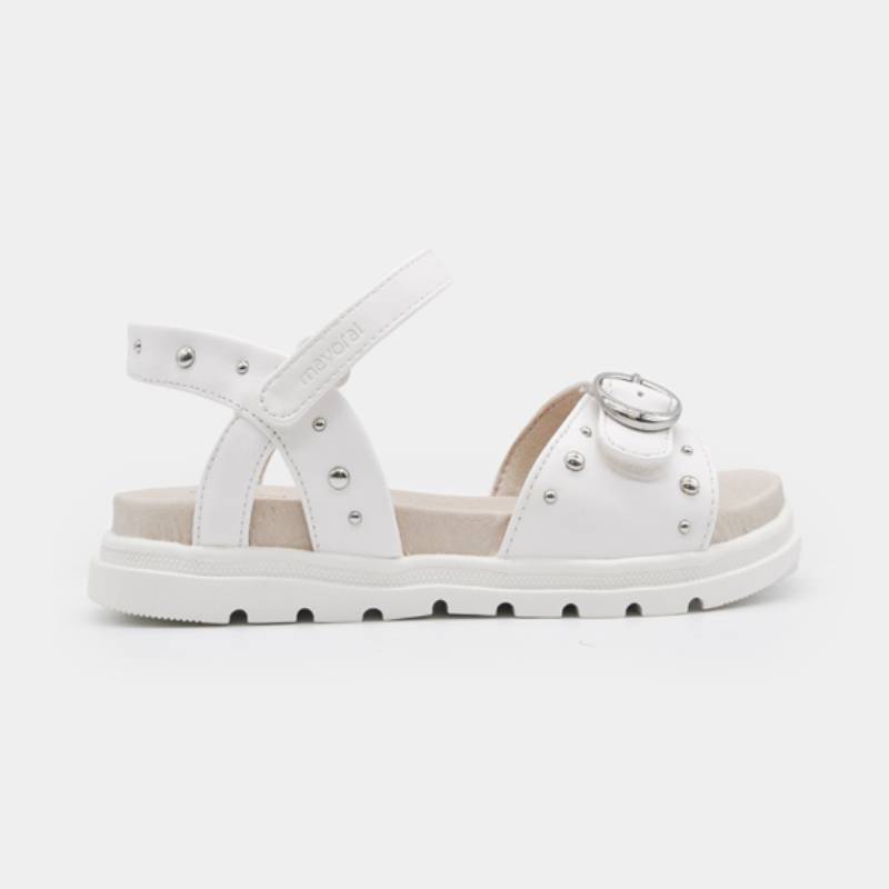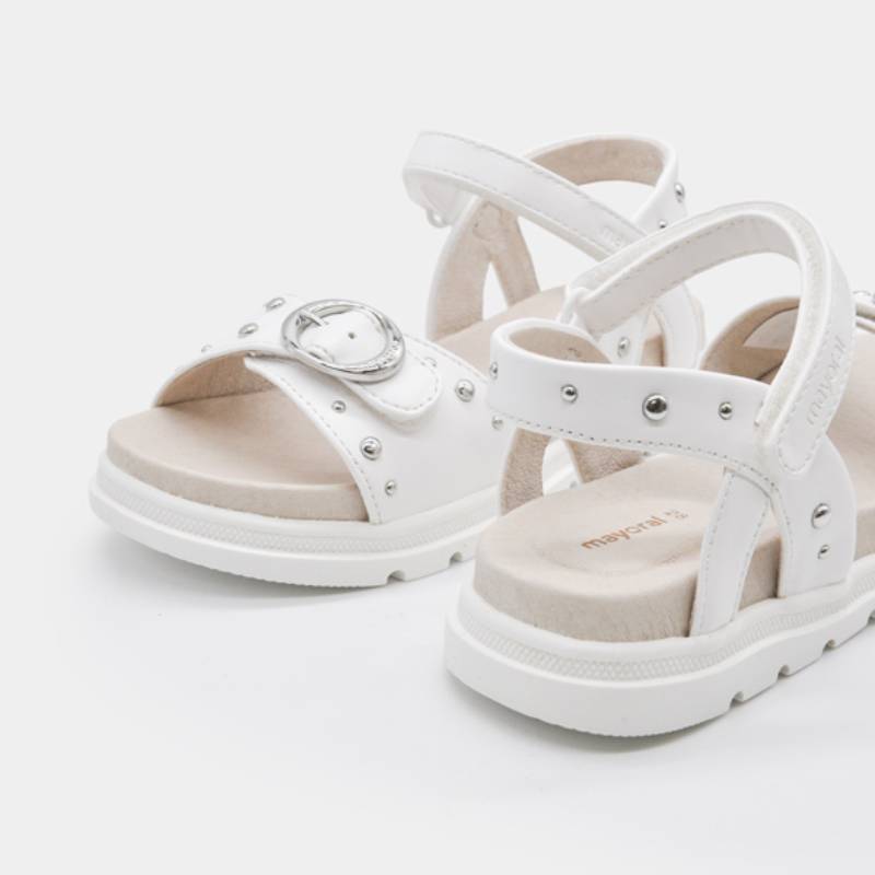Παιδικά σανδάλια από την Mayoral. Με ρυθμιζόμενο βέλκρο, που αγκαλιάζει τέλεια τον αστράγαλο για μέγιστη άνεση και σταθερότητα. Επίσης ρυθμίζονται και στο μπροστινό μέρος ανάλογα με το φάρδος του ποδιού. Η ιδανική επιλογή για τα αμπιγιέ αλλά και τα καθημερινά ντυσίματα ενός κοριτσιού. Τα τρουκς και τα μεταλλικά στοιχεία που το κοσμούν, τα κάνουν άκρως εντυπωσιακά. Διαθέτουν μαλακό, δερμάτινο πάτο καθώς και αντιολισθητική σόλα.