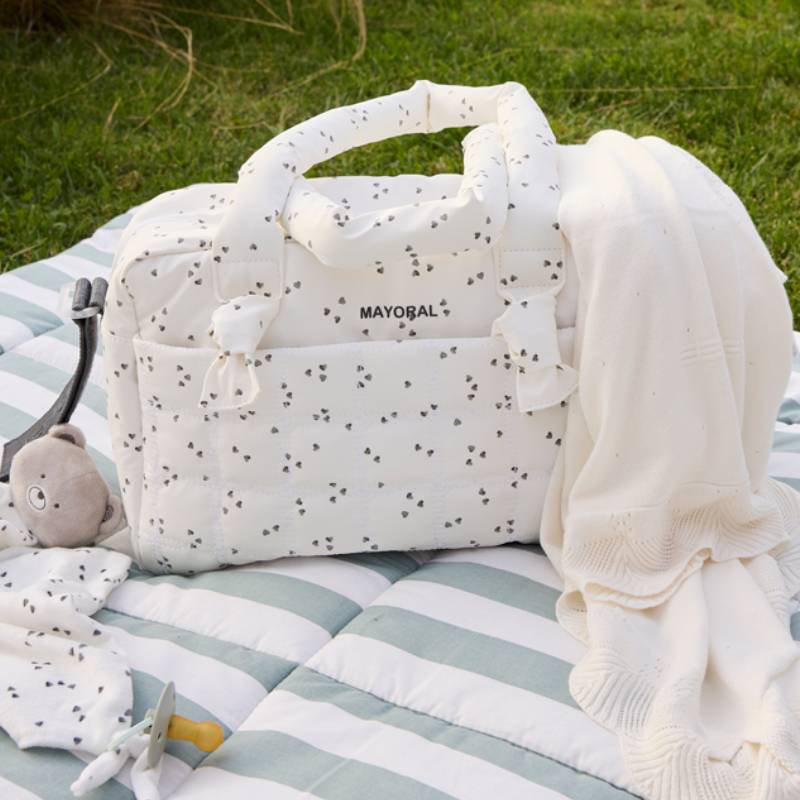 Τσάντα από την Mayoral. Για να μεταφέρετε όλα τα απαραίτητα σε κάθε σας εξόρμηση με το μωρό σας. Ανοίγει με διπλό φερμουάρ και διαθέτει χειρολαβές, αποσπώμενο ιμάντα ώμου και λουράκια κρέμασης για το καρότσι. Διαθέτει επίσης αρκετές θήκες εσωτερικά και εξωτερικά για καλύτερη οργάνωση. Εσωτερικά η μια θήκη είναι ισοθερμική για να τοποθετείτε την τροφή του μωρού και να την κρατάει σε σωστή θερμοκρασία. Επίσης διαθέτει μια μικρή θήκη για την πιπίλα του μωρού, για εύκολη και άμεση πρόσβαση. Επίσης ένα υφασμάτινο τσαντάκι που περιέχεται στην τσάντα, μπορεί να χρησιμοποιηθεί είτε ως νεσεσέρ είτε για να βάλετε προσωρινά τα λερωμένα ρούχα του μωρού σας. Συνδυάστε την με τα υπόλοιπα αξεσουάρ και δημιουργήστε ένα υπέροχο και ταυτόχρονα πρακτικό σετ για τη μεταφορά των απαραίτητων πραγμάτων του μωρού σας.