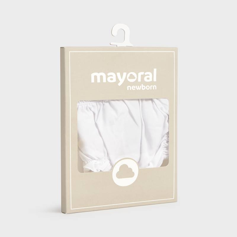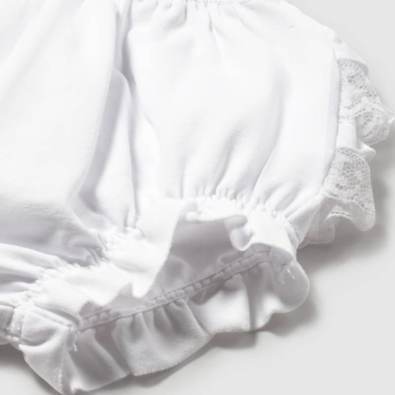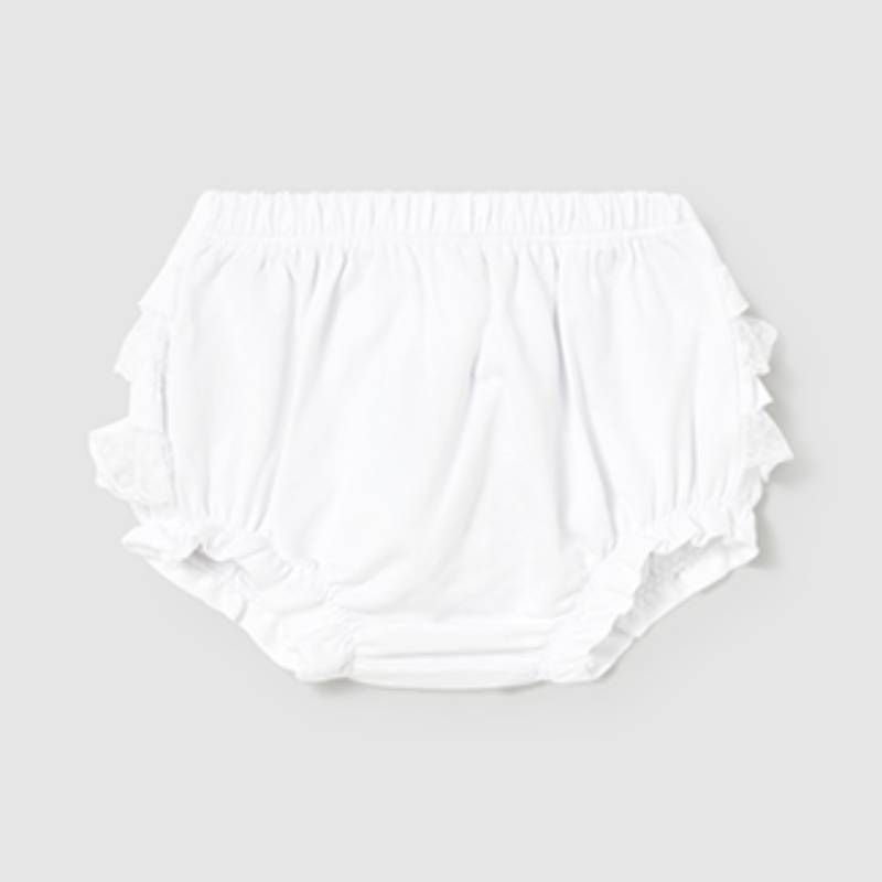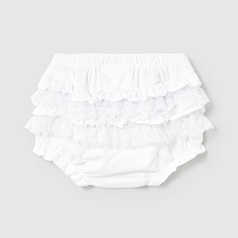 Βρακάκι με φρουφρουδένιο βολάν στο πίσω μέρος, για νεογέννητο κορίτσι εως 18 μηνών, από την Mayoral. Συνδυάστε το με τις κοντές φουστίτσες του μωρού σας και κάντε τις εμφανίσεις σας μοναδικές και άκρως εντυπωσιακές.