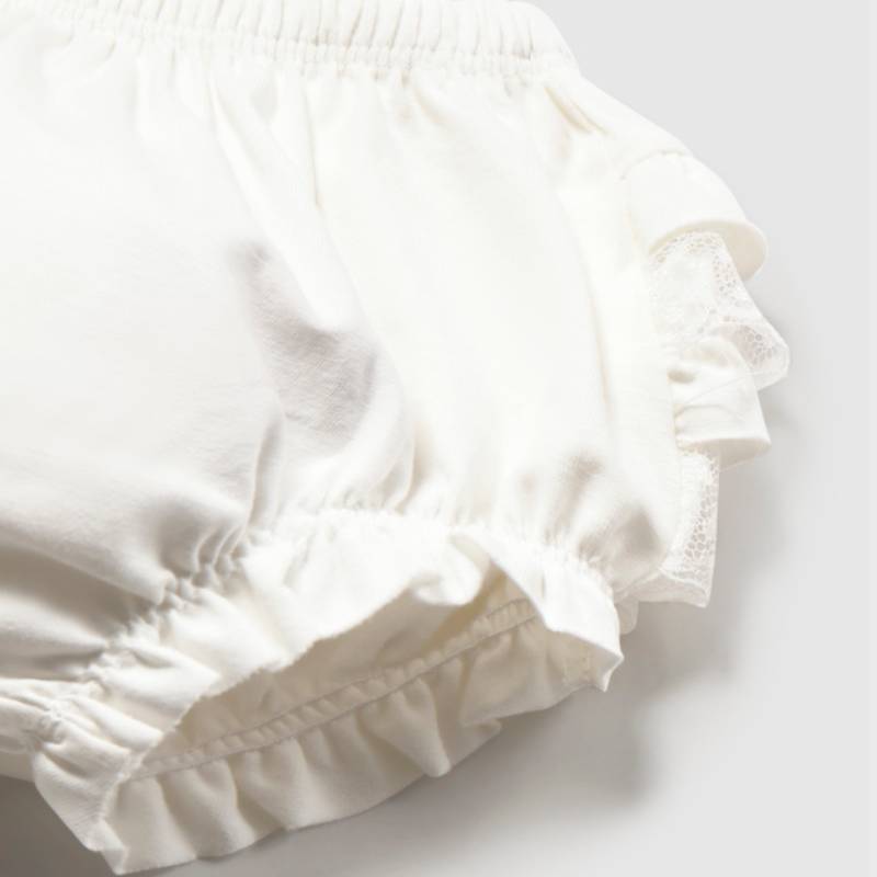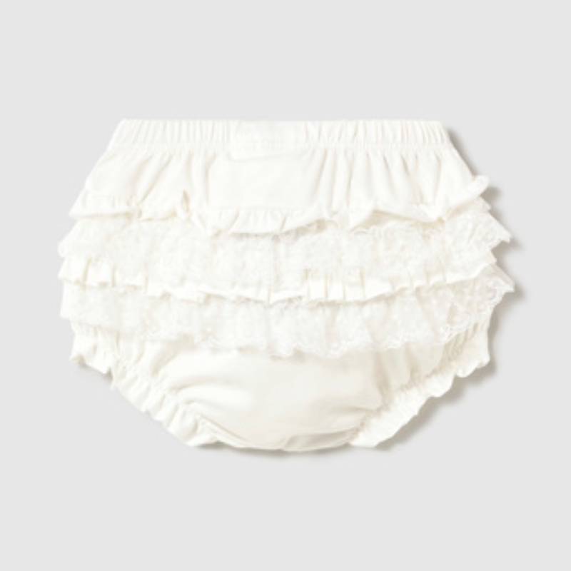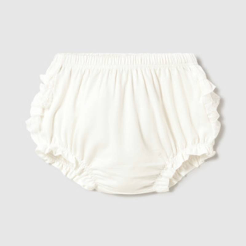 Βρακάκι με φρουφρουδένιο βολάν στο πίσω μέρος, για νεογέννητο κορίτσι εως 18 μηνών, από την Mayoral. Συνδυάστε το με τις κοντές φουστίτσες του μωρού σας και κάντε τις εμφανίσεις σας μοναδικές και άκρως εντυπωσιακές.