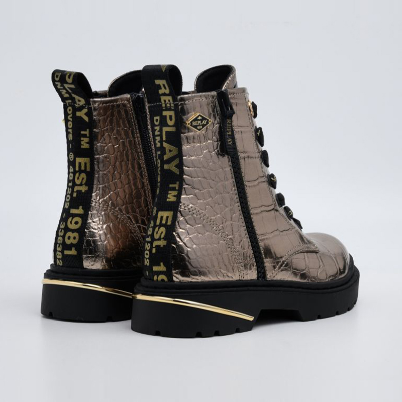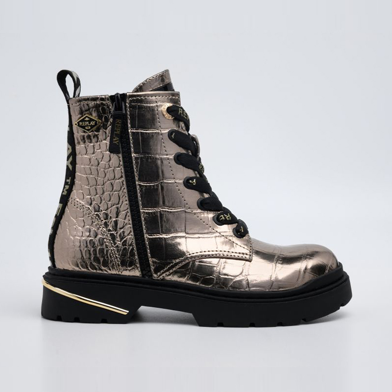 Παιδικά μποτάκια-αρβυλάκια από την Replay. Με κορδόνια και φερμουάρ στο πλάι για τέλεια εφαρμογή. Η ιδανική επιλογή για όλα τα ντυσίματα ενός παιδιού. Οι μεταλλικές λεπτομέρειες σε συνδυασμό με το κροκό δέρμα τα κάνουν άκρως εντυπωσιακά. Διαθέτουν μαλακό πάτο καθώς και εύκαμπτη αντιολισθητική, τρακτερωτή σόλα.