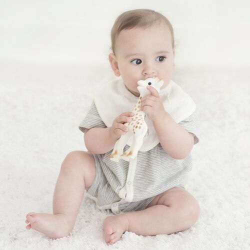 Η Σόφι είναι φτιαγμένη από 100% φυσικό καουτσκούκ και χρώματα που χρησιμοποιούνται και στη μαγειρική. Είναι απολύτως ασφαλής να τη μασάει το μωρό, όπως θα έκανε με μία πιπίλα ή τη θηλή ενός μπουκαλιού. Η απαλή υφή της και τα πολλά μασώμενα μέρη της (αυτιά, κέρατα, πόδια), δίνουν στο μωρό τεράστια ανακούφιση στα πονεμένα ούλα του, κατά τη διάρκεια της οδοντοφυϊας.